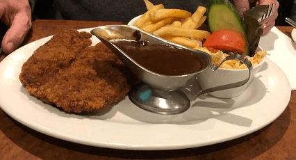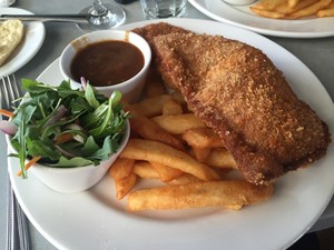 Anyway, moving onto the schnitty. The Price of the schnitty was a total of $22.5 + $2 for gravy which I thought was a stitch up compared to more schnitty’s that are of a cheaper price and possibly of better deliciousness. The Schnitty was served with fresh garden salad with some tartar sauce and also crispy golden chips. The schnitty was of a decent size, it did take up half the plate; however the schnitty was not flat but rather curved which made cutting it up slightly difficult as it makes keeping everything on the plate troublesome.